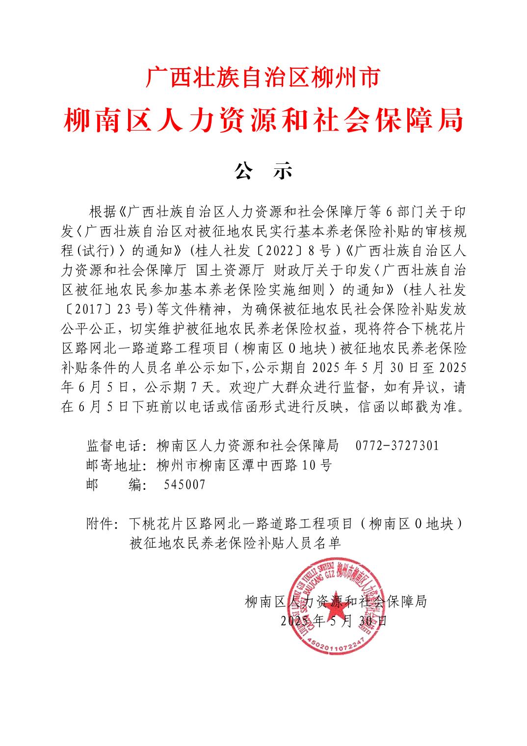 下桃花片區(qū)路網(wǎng)北一路道路工程項(xiàng)目(柳南區(qū)O地塊)被征地農(nóng)民養(yǎng)老保險(xiǎn)補(bǔ)貼的公示