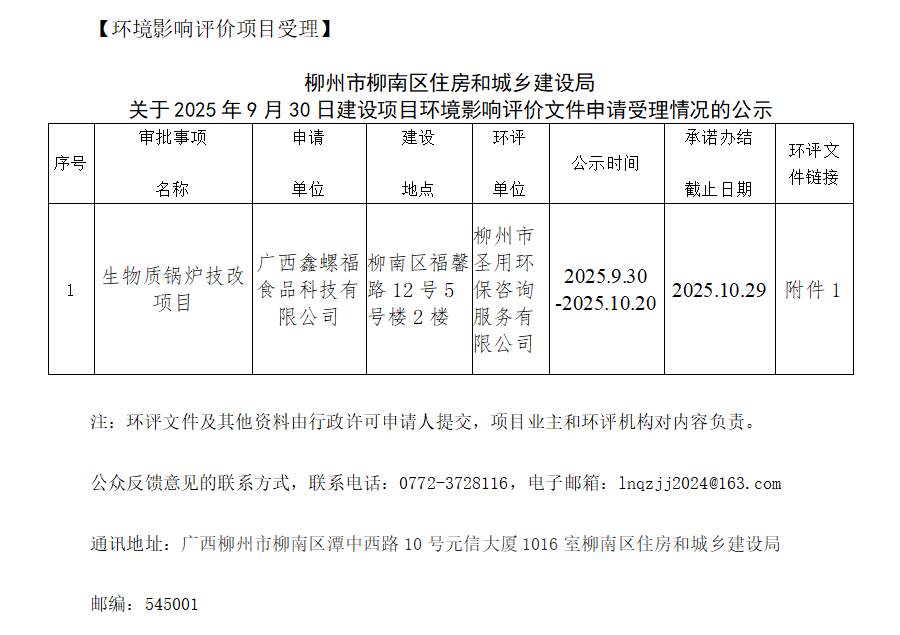 2025年9月30日生物質(zhì)鍋爐技改建設(shè)項(xiàng)目環(huán)境影響評(píng)價(jià)文件申請(qǐng)受理情況的公示