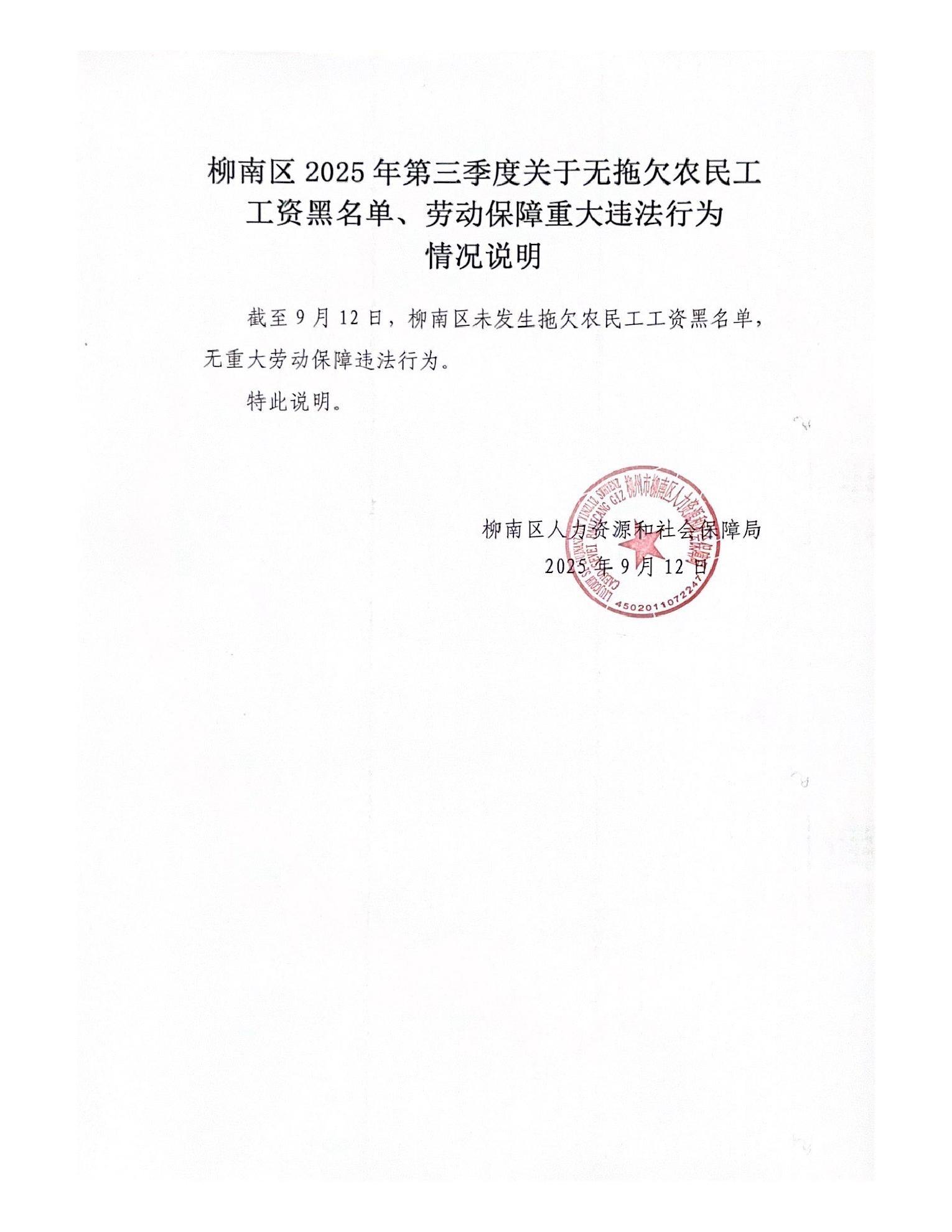 柳南區(qū)2025年第三季度關(guān)于無(wú)拖欠農(nóng)民工工資黑名單、勞動(dòng)保障重大違法行為情況說(shuō)明